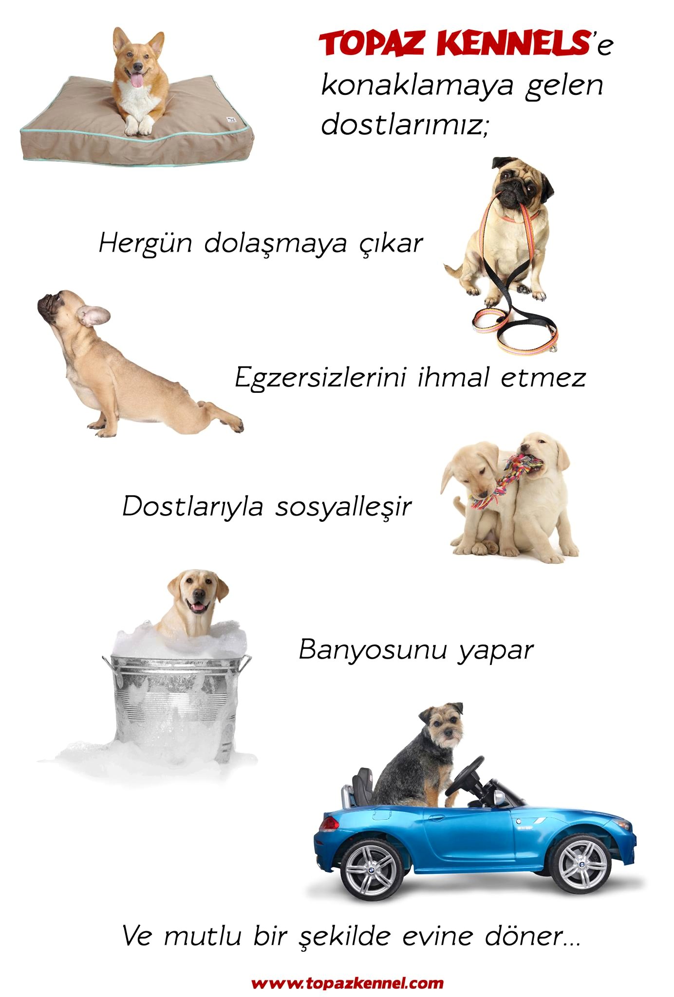 Köpeklerimiz her ne kadar ailemizin bir parçası olsalar da bazı durumlarda onlardan ayrı kalmak zorunda kalabiliyoruz. Tatiller, iş seyahatleri, taşınma, sağlık problemleri ve bunun gibi durumlarda "Köpeğimiz ne olacak?" , “Köpeğimize kim bakacak ?” sorularına cevap aramanıza gerek yok. Can dostlarınızı kendilerini evinde hissedebileceği, yalnızlık stresinden uzak, rahatça koşup oynayabileceği, arkadaşlar edinip sosyalleşebileceği, güvenli bir yere tatile göndermeye ne dersiniz..